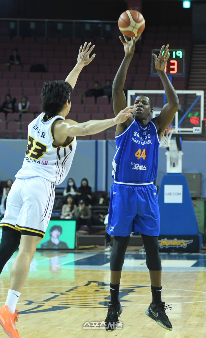 서울 삼성 앤드류 니콜슨이 12일 서울 잠실실내체육관에서 열린 2025~2026 프로농구 창원 LG와 경기에서 슛을 시도하고 있다.