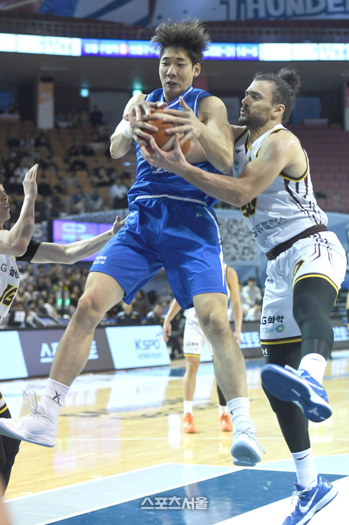 서울 삼성 이원석이 12일 서울 잠실실내체육관에서 열린 2025~2026 프로농구 창원 LG와 경기에서 상대 마레이와 루스볼 다툼을 하고 있다.