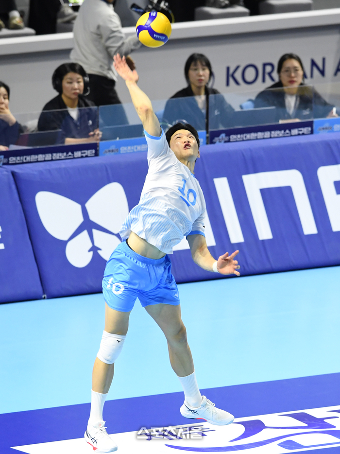 대한항공 정지석이 12일 인천 계양체육관에서 열린 2025-2026 V리그 남자부 삼성화재와 경기에서 스파이크 서브를 넣고 있다. 2025. 11. 12.