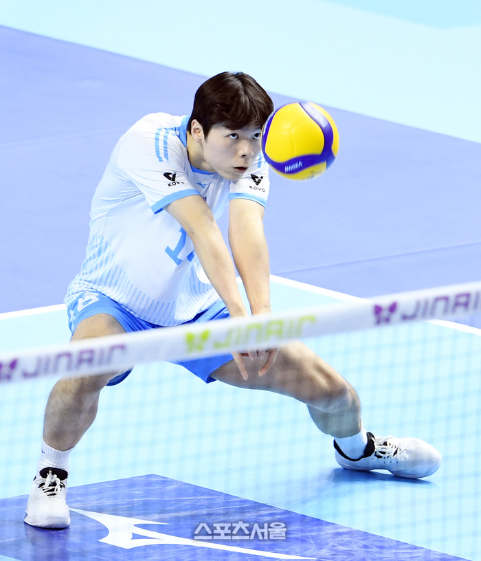대한항공 정한용이 12일 인천 계양체육관에서 열린 2025-2026 V리그 남자부 삼성화재와 경기에서 서브 리시브를 하고 있다. 2025. 11. 12.