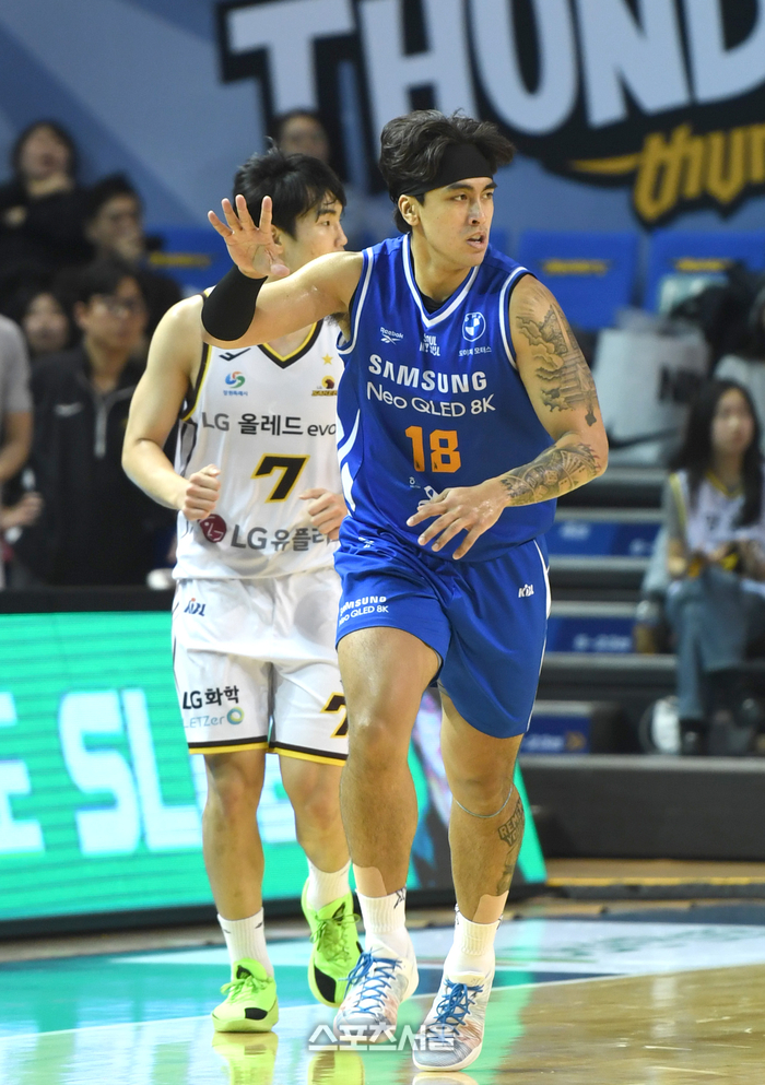 서울 삼성 구탕이 12일 서울 잠실실내체육관에서 열린 2025~2026 프로농구 창원 LG와 경기에서 득점 후 환호하고 있다.