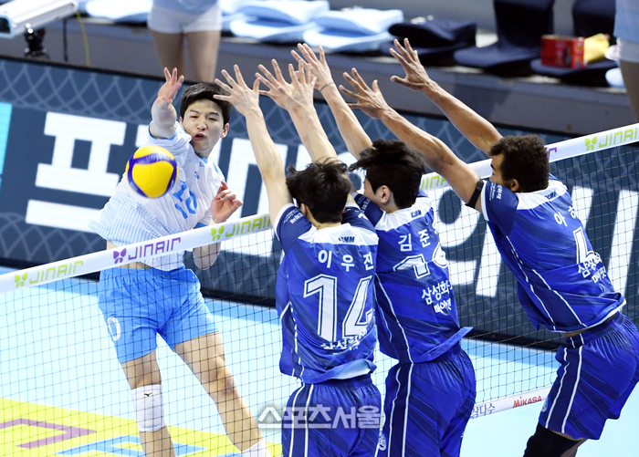 대한항공 정지석(맨 왼쪽)이 12일 인천 계양체육관에서 열린 2025-2026 V리그 남자부 삼성화재와 경기에서 상대 블로킹을 피해 공격을 하고 있다. 2025. 11. 12.