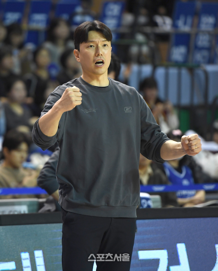 서울 삼성 김효범 감독이 12일 서울 잠실실내체육관에서 열린 2025~2026 프로농구 창원 LG와 경기에서 작전지시를 하고 있다.