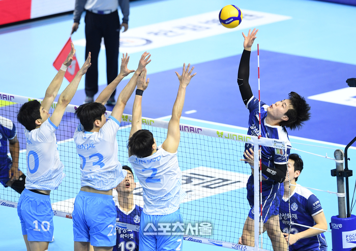 삼성화재 이윤수(오른쪽)가 12일 인천 계양체육관에서 열린 2025-2026 V리그 남자부 대한항공과 경기에서 페인트 공격을 하고 있다. 2025. 11. 12.