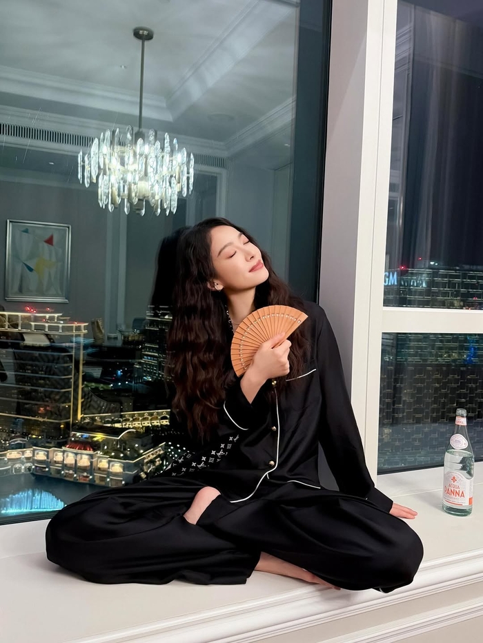빅토리아는 13일 오후 자신의 인스타그램을 통해 마카오의 야경이 한눈에 보이는 창가에 앉아 찍은 사진 여러 장을 게시했다. 올블랙 실크 파자마를 입고 손에는 부채를 든 채 장난스러운 표정을 짓는가 하면, 물병을 들고 의기양양하게 포즈를 취하는 등 자연스러운 매력을 뽐냈다.