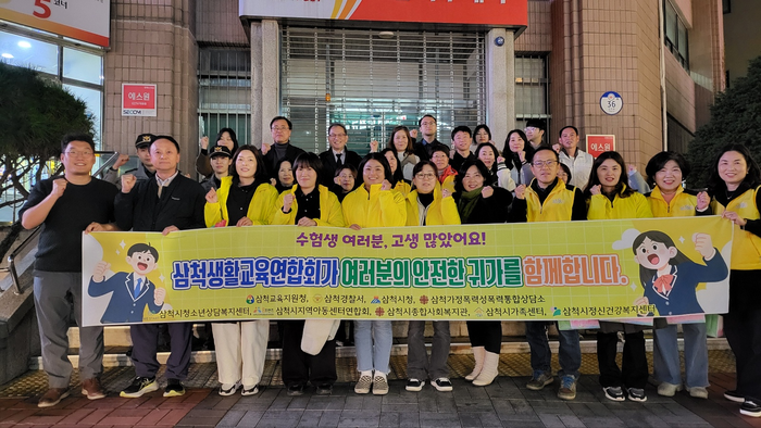 [스포츠서울ㅣ김기원기자]강원특별자치도 삼척교육지원청(교육장 홍명표)은 지난 13일(목), 삼척생활교육연합회(△삼척시청아동청소년과 △삼척경찰서 △삼척시정신건강복지센터△삼척시 가족센터 △삼척시종합사회복지관 △삼척가정폭력성폭력통합상담소 △삼척시청소년상담복지센터 △삼척시지역아동센터연합회) 소속 35명과 함께 수능 후 학생 조기 귀가지도 및 학교 밖 학생생활지도를 위한 합동 순찰을 실시하였다.