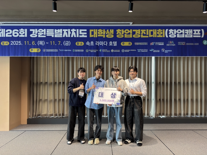[스포츠서울ㅣ원주=김기원기자]연세대학교 미래캠퍼스(미래캠퍼스부총장 하연섭, 이하 ‘미래캠퍼스’)는 11월 6일(목)부터 7일(금)까지 속초 라마다호텔에서 열린 ‘제26회 강원특별자치도 대학생 창업경진대회(창업캠프)’를 미래캠퍼스 RISE사업단이 공동 주관했다고 밝혔다. 이번 대회에는 미래캠퍼스 학생 3개 팀(9명)이 참가하여 창업 아이템 고도화와 발표 역량을 강화하는 시간을 가졌다.