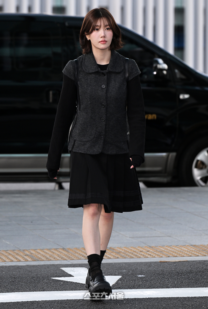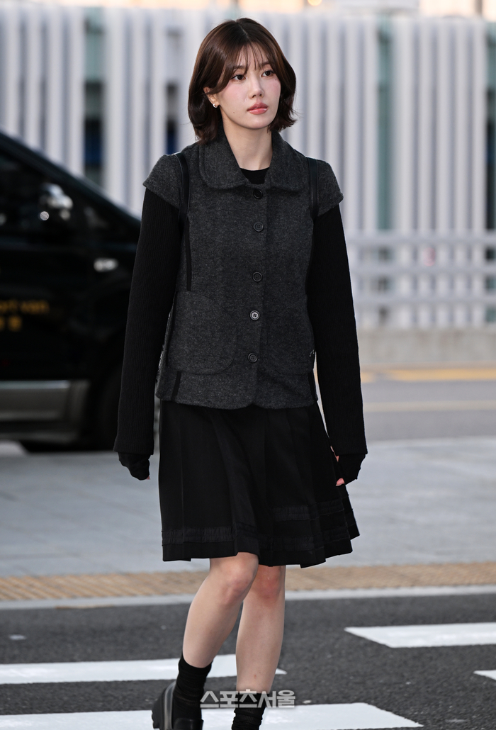 테일러드 실루엣의 베스트는 단정한 칼라와 버튼 디테일로 클래식한 감성을 더했으며, 검은색 A라인 미니스커트와 매치해 여성스러운 분위기를 연출했다.