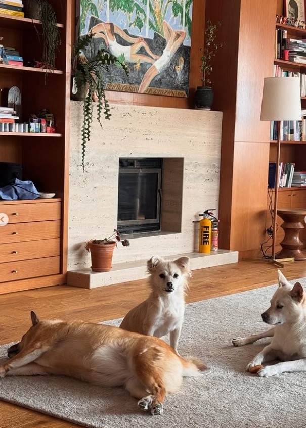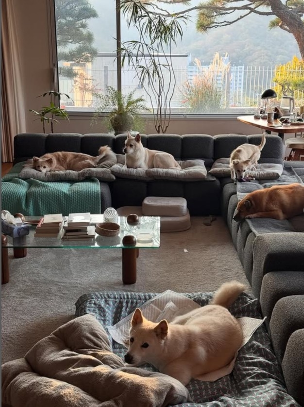 14일 “요즘”이라는 짧은 글과 함께 올린 사진에는 소파와 카펫 위로 반려견들이 늘어져 쉬는 모습, 큰 창으로 그림 같은 뷰가 펼쳐진 거실, 벽난로 앞의 온기가 고스란히 담겼다.