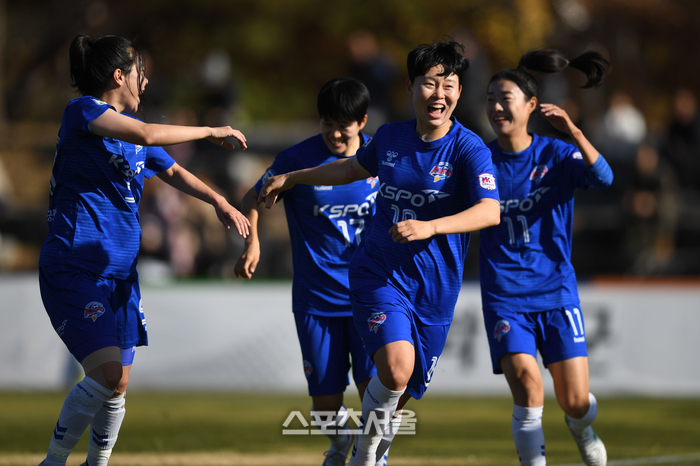 화천 KSPO 최유정이 15일 화천생활체육공원 주경기장에서 열린 2025 WK리그 챔피언결정전 서울시청과 2차전에서 두 번째 골을 넣은 후 환호하고 있다.
