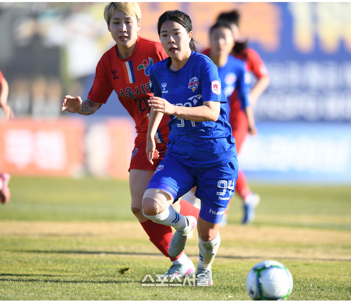 화천 KSPO 이수빈이 15일 화천생활체육공원 주경기장에서 열린 2025 WK리그 챔피언결정전 서울시청과 2차전에서 드리블을 하고 있다.