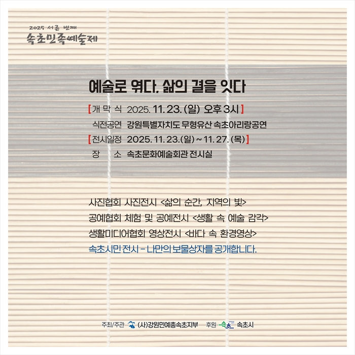 올해 행사는 ‘예술로 엮다, 삶의 결을 잇다’를 슬로건으로 지역의 일상과 예술을 교감하는 장르 융합형 전시로 꾸며진다. 사진, 공예, 생활미디어협회 회원들이 1년 동안 만난 속초의 일상과 자연을 다양한 방식으로 담아낸다.