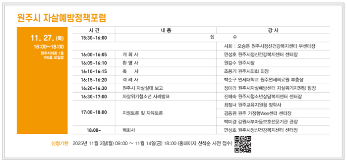 주요 프로그램으로 ▲원주시 자살실태 보고(원주시자살예방센터 정미라 자살위기지원팀장) ▲자살위기청소년 사례발표(진혜숙 원주시청소년상담복지센터장) ▲지정토론 및 자유토론(원주교육지원청 최정녀 장학사, 김동원 원주가정형Wee센터장, 박미경 강원서부아동보호전문기관장) 등이 진행된다.