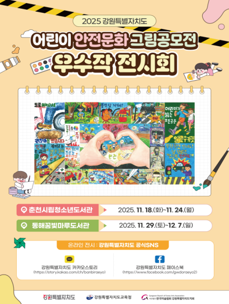 [스포츠서울ㅣ춘천=김기원기자]강원특별자치도(도지사 김진태)는 11월 18일부터 12월 7일까지 춘천시립청소년도서관과 동해꿈빛마루도서관에서 「어린이 안전문화 그림 공모전 우수작 전시회」를 개최한다고 밝혔다.