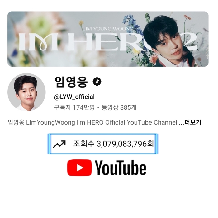 임영웅의 공식 유튜브 채널인 ‘임영웅’은 지난 17일 누적 조회수 30억7000만 뷰를 달성했다. 이는 ‘영웅시대’(팬덤명)의 꾸준한 관심과 사랑이 만들어낸 대기록이다.