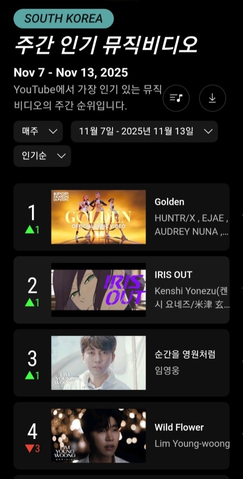 유튜브 한국 주간 인기 뮤직비디오 차트(11월 7일~11월 13일)에 따르면, 지난 8월 28일 공개된 임영웅 정규 2집 ‘IM HERO 2’의 타이틀곡 ‘순간을 영원처럼’ 뮤직비디오가 3위에 올랐다. ‘순간을 영원처럼’은 서정적인 가사와 삶에 대한 깊은 울림을 전한다.