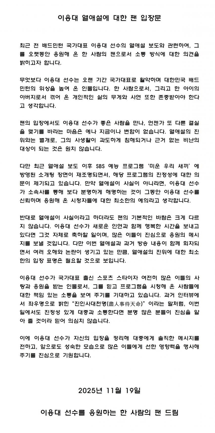 그는 “무엇보다 이용대 선수는 오랜 기간 국가대표로 활약하며 대한민국 배드민턴의 위상을 높여 온 인물이다. 한 아이의 아버지로서 겪어 온 개인적인 삶의 무게와 사연 또한 존중받아야 한다고 생각한다”며 “팬의 입장에서도 이용대 선수가 좋은 사람을 만나, 언젠가 또 다른 결실을 맺기를 바라는 마음은 예나 지금이나 변함이 없다. 열애설의 진위와는 별개로, 그의 사생활이 과도하게 침해되거나 근거 없는 비난의 대상이 되는 것은 원치 않는다”고 했다.