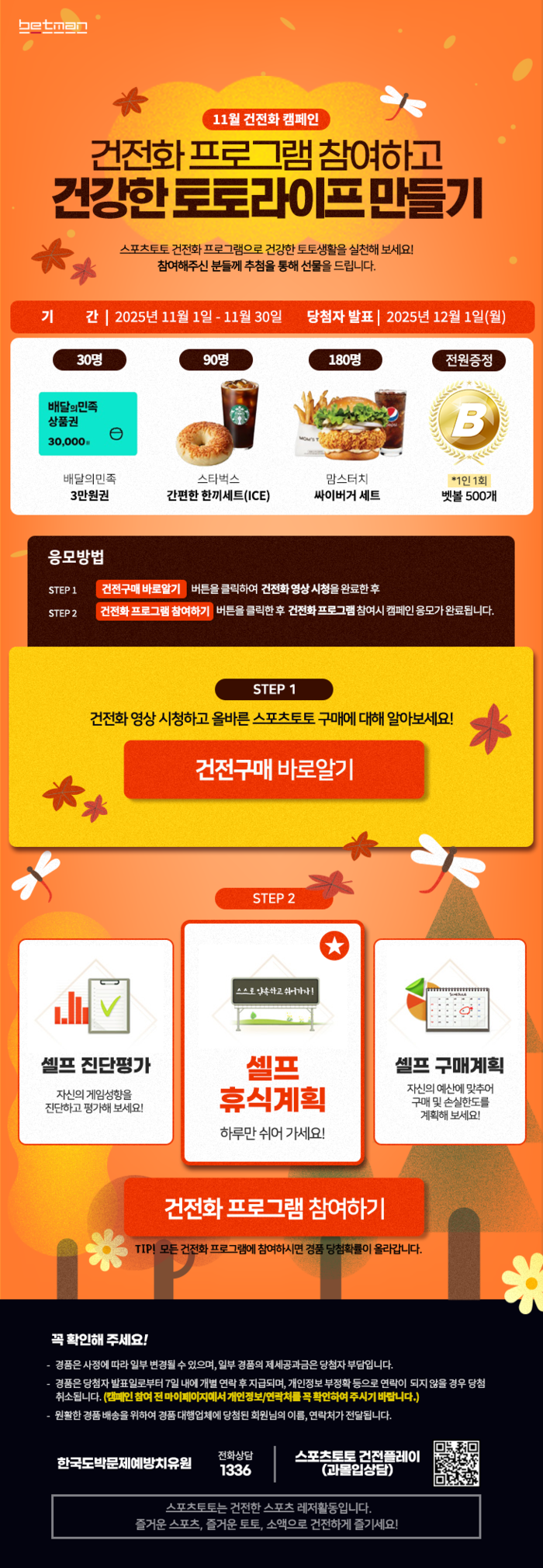 11월 건전화 캠페인 ‘건전화 프로그램 참여하고 건강한 토토라이프 만들기’ 이벤트의 마감이 코앞으로 다가왔다.