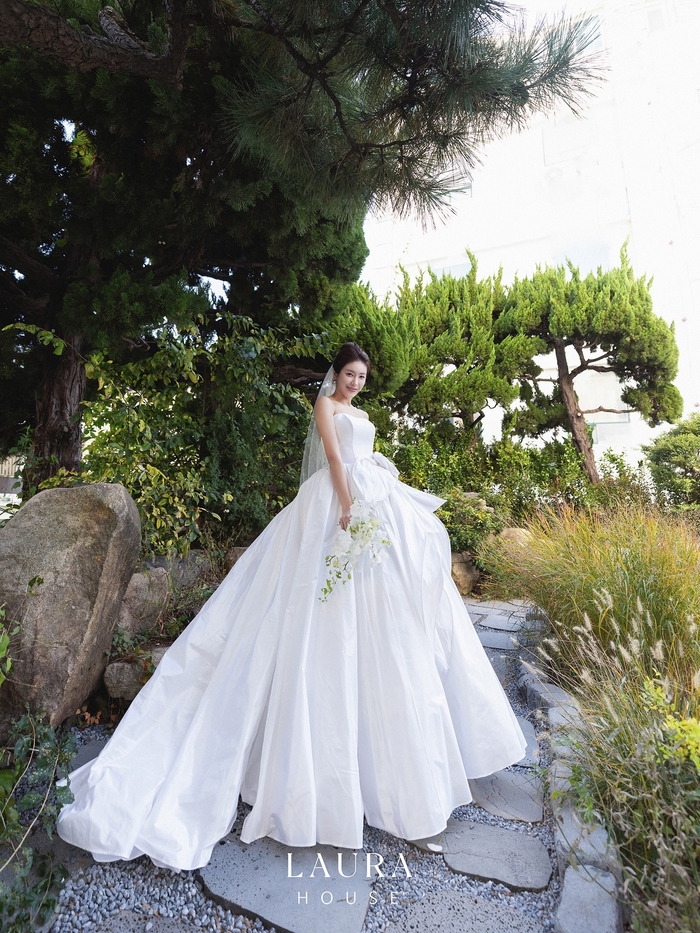 클래식한 분위기의 풍성한 벨 라인 드레스에 면사포를 매치해 청순하고 화사한 신부의 정석을 보여줬다.