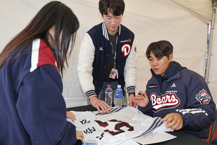 본격적인 행사 시작에 앞서 그라운드 한쪽에서 사인회가 진행됐다. 양의지 정수빈 양석환 등 베테랑 선수부터 김택연 박준순 등 젊은 선수들까지 성심성의껏 팬들에게 사인을 해줬다. 좋아하는 선수를 가까이서 보는 팬들의 얼굴에는 웃음이 떠나지 않았다.