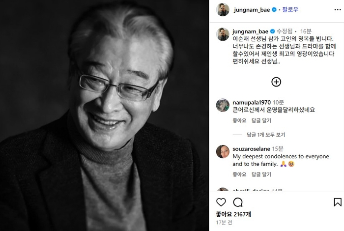 배정남은 이날 자신의 소셜미디어 계정(SNS)에 “이순재 선생님 삼가 고인의 명복을 빕니다”라며 “너무나도 존경하는 선생님과 드라마를 함께할 수 있어서 제 인생 최고의 영광이었습니다. 편히 쉬세요.세요 선생님..”이라는 글과 함께 고(故) 이순재의 사진을 게재했다.