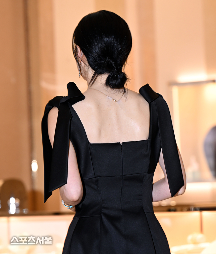 이날 이영애는 블랙 새틴 소재의 롱 드레스를 선택해 행사의 격조를 한층 높였다. 스퀘어 넥라인과 코르셋 스타일의 보디스가 돋보이는 이 드레스는 어깨 부분에 과감한 리본 디테일을 더해 클래식함과 모던함을 동시에 구현했다. 특히 백리스(backless) 디자인은 우아하면서도 세련된 매력을 강조했다.