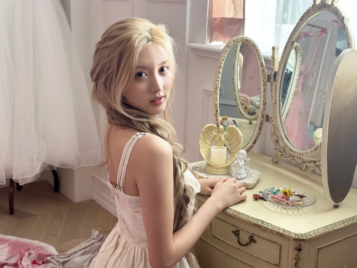 다른 사진들에서는 레이스로 장식된 화장대 앞에 앉아 카메라를 응시하거나, 핑크색 천막으로 둘러싸인 침대에 기대앉아 신비로운 눈빛을 보내는 등 다채로운 매력을 발산했다.