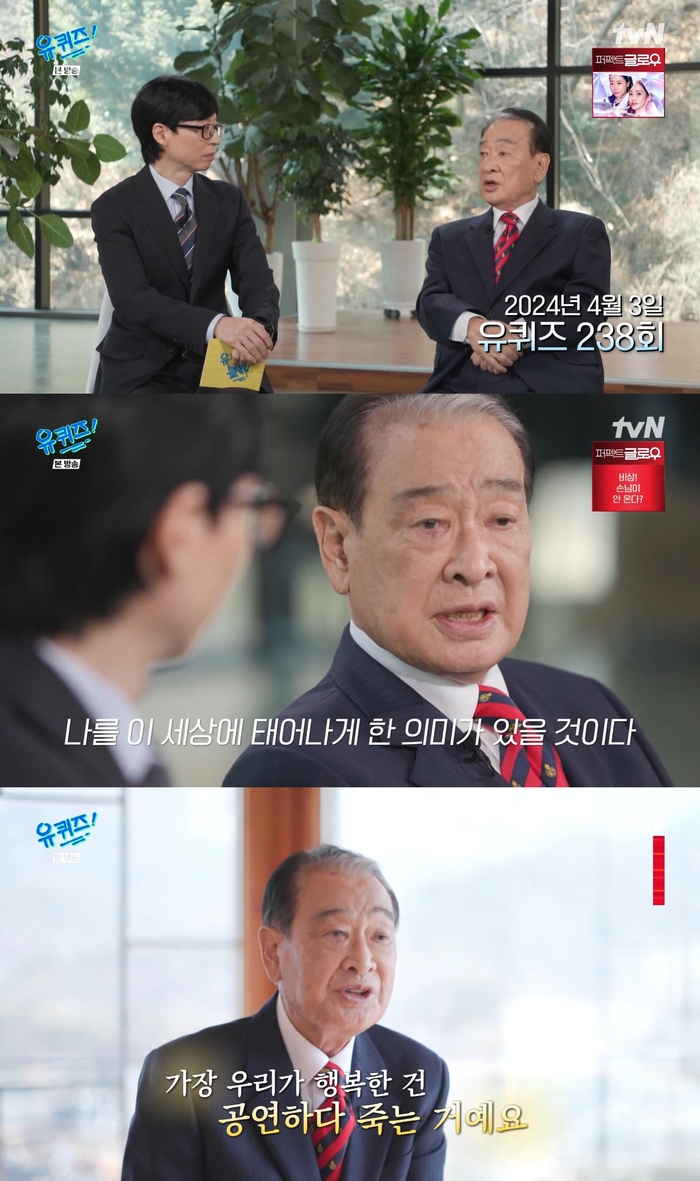 이순재는 “TBC 개국 멤버 중 남은 건 나 하나 밖에 없는데 내가 가야 저승에서 만날 수 있다”며 “내가 농담삼아 얘기하는데 무대에서 쓰러져 죽는게 배우로서는 가장 행복한 순간”이라고 죽음에 대한 생각을 밝혔다.