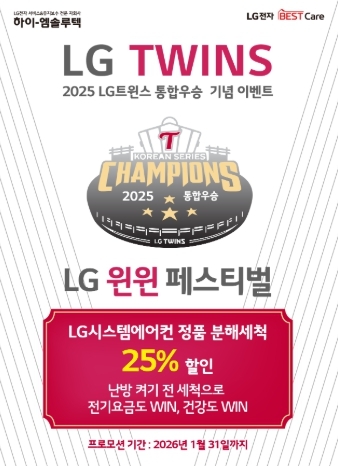 [스포츠서울 | 표권향 기자] LG전자 냉난방공조(HVAC) 유지보수 자회사 하이엠솔루텍이 프로야구 LG 트윈스의 정규 시즌·한국시리즈 통합 우승을 기념, 내년 1월31일까지 ‘LG윈윈페스티벌’ 세척 프로모션을 진행한다고 밝혔다.