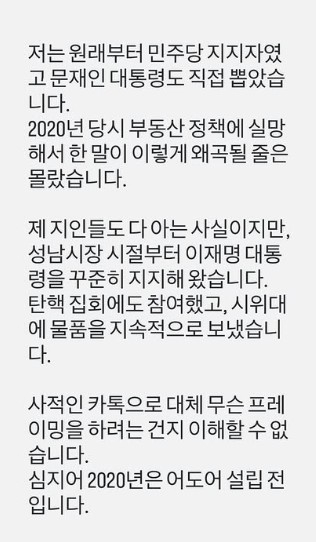 이어 “성남시장 시절부터 이재명 대통령을 꾸준히 지지해 왔다. 탄핵 집회에도 참여했고 물품도 보냈다”며 “2020년은 어도어 설립 전이고, 사적 카톡을 끌어와 무슨 프레임을 씌우려는지 모르겠다”고 강조했다.