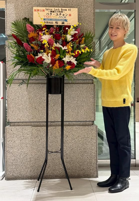 또 다른 사진 속엔 선물받은 화환을 자랑하고 있는 박유천의 모습이 담겨있다.