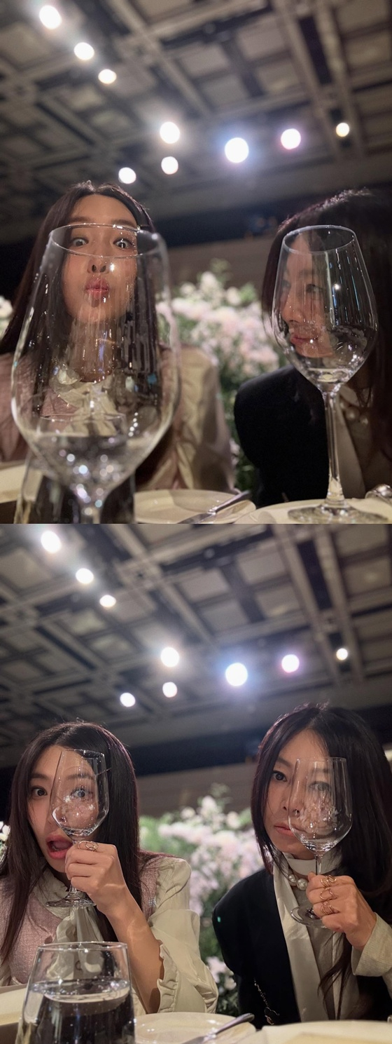 모녀는 와인잔을 얼굴 앞으로 가져다 대고 카메라를 응시하는 등 장난기 넘치는 셀카도 남겼다. 커다란 와인잔 너머로 보이는 눈동자와 표정이 그대로 담기며, 격식 있는 예식장 분위기 속에서도 편안하게 결혼식을 즐기는 모습이 전해진다.