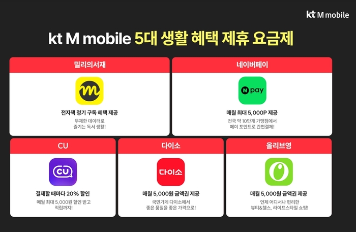 5대 생활 혜택 제휴 요금제(이하 오대장)는 밀리의서재·네이버페이·CU·다이소·올리브영 혜택 요금제다. 구독형 콘텐츠부터 편의점, 뷰티, 쇼핑까지 생활 전반을 아우르는 혜택을 제공한다.