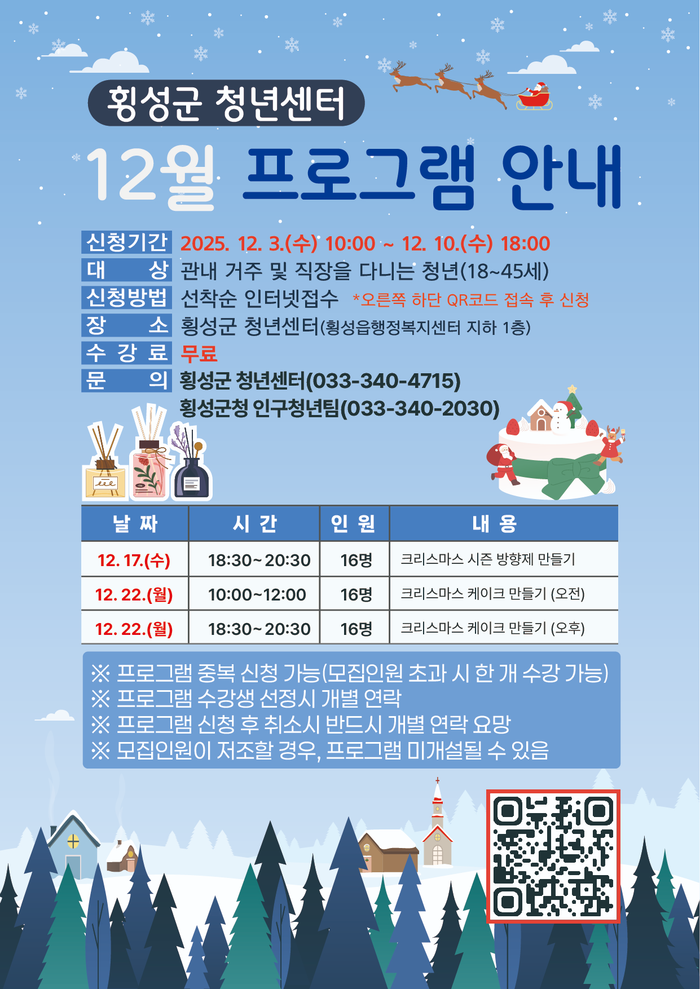 도만조 군 기획예산담당관은 “추운 겨울, 크리스마스 시즌을 맞아 횡성군 청년센터가 단순한 시설을 넘어 청년들이 따뜻하게 머물며 배우고 즐길 수 있는 생활 거점으로 자리매김해, 언제 든 편하게 찾아와 온기를 나누는 열린 공간이 되기를 바란다”라고 말했다.