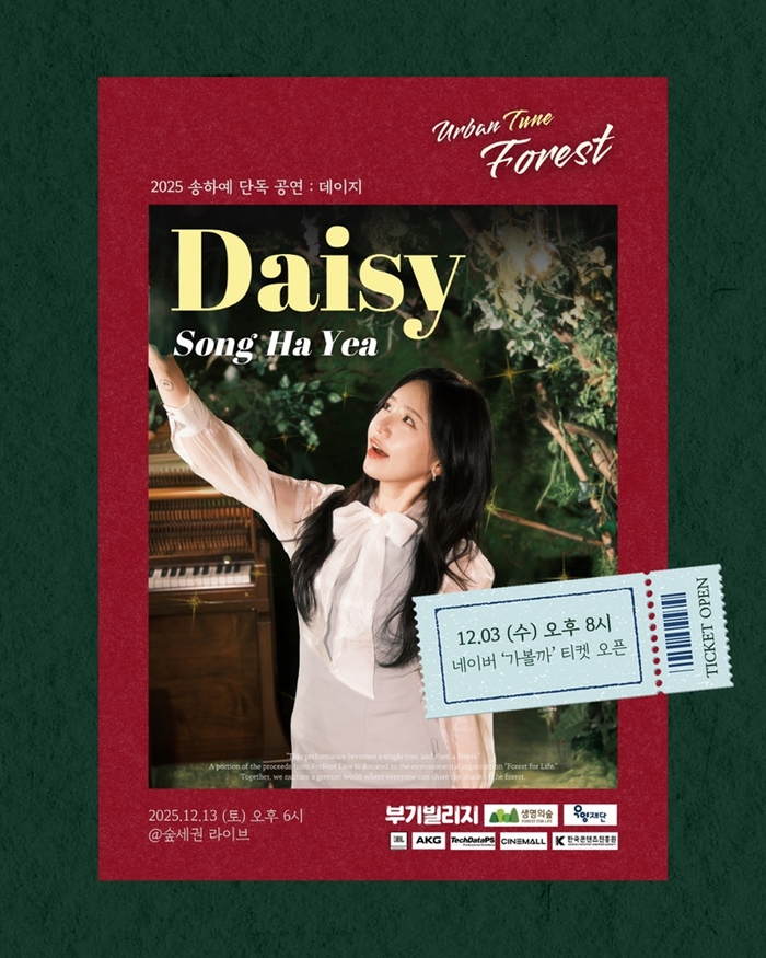 송하예는 13일 오후 6시 숲세권 라이브에서 단독 공연 ‘데이지’를 연다. 이번 공연은 숲세권 라이브 ‘Urban Tune Forest’와 공동 프로젝트로, 한 번 지고도 다시 피어나는 작은 꽃 데이지처럼 지친 일상 속 이들에게 위로를 전하고자 기획됐다.