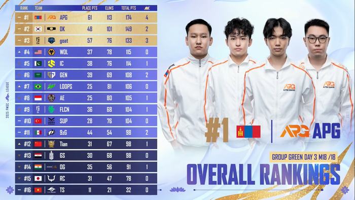 그린조(Group Green)가 일정을 먼저 소화했다. 3일간 총 18경기를 치렀고 상위 3팀이 결정됐다. 알파 게이밍과 디플러스 기아, 고트가 나란히 1~3위를 차지했다. 그린조의 유일한 한국팀이었던 디플러스 기아는 2위라는 좋은 성적과 함께 기분 좋은 결승행을 확정 지었다.