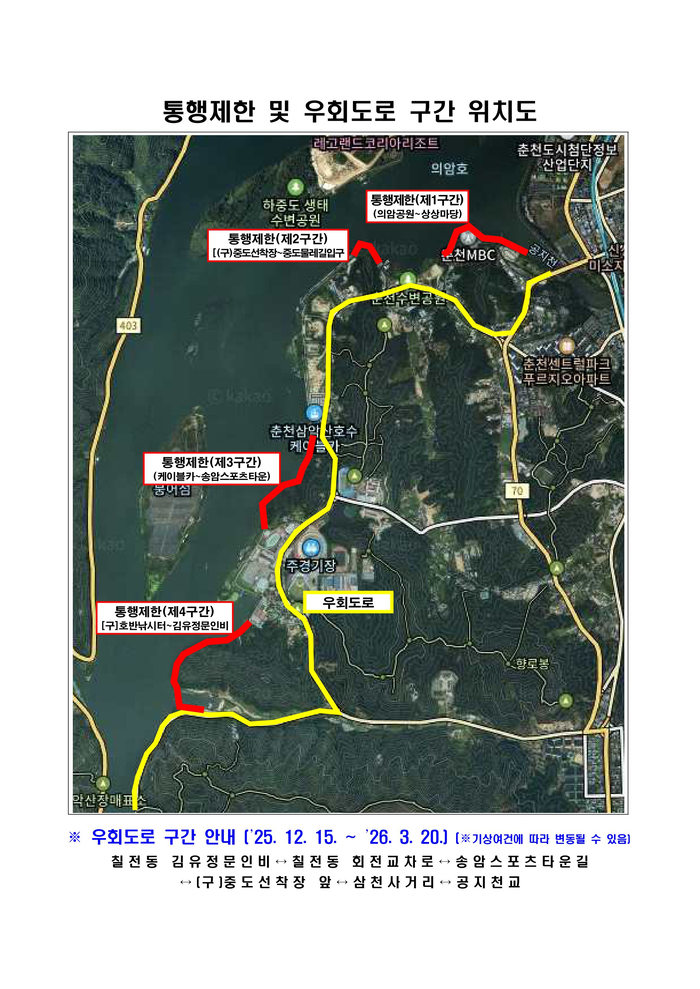 4일부터 내년 3월 20일까지 도로 5곳 통제