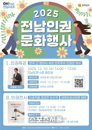 [스포츠서울ǀ 조광태 기자] 전라남도가 세계인권선언 77주년을 맞아 인권 문화 확산을 위해 오는 9일부터 17일까지 인권 특강, 인권공모전 우수작 전시회 등 ‘2025 도민인권증진 문화행사’를 연다.
