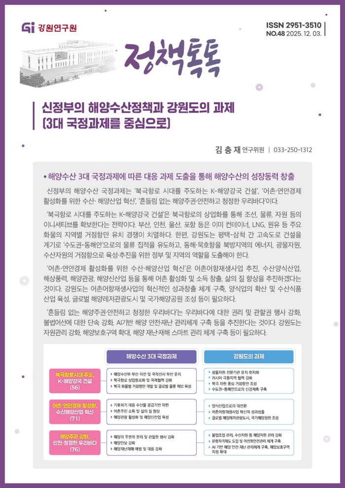 [스포츠서울ㅣ춘천=김기원기자]강원연구원(원장 배상근)은 ‘신정부의 해양수산정책과 강원도의 과제(3대 국정과제를 중심으로’라는 제목으로 2025년 제48호 정책톡톡을 발간했다.