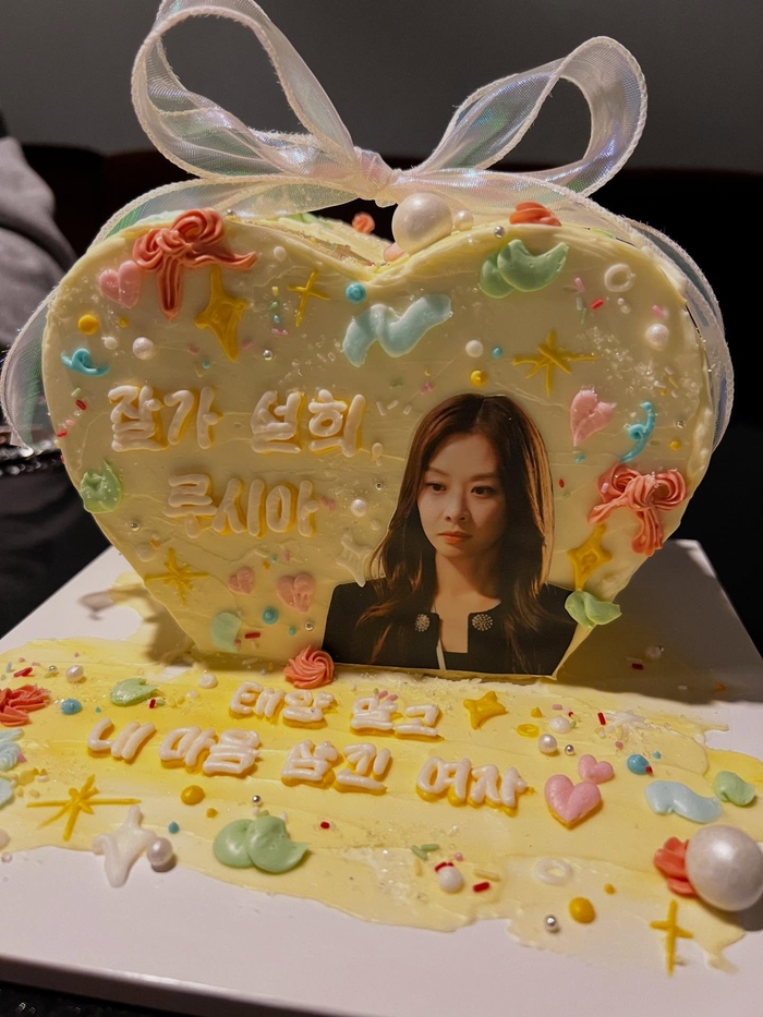 공개된 사진 속 장신영은 동료가 준비해준 ‘잘가 설희, 루시아. 태양 말고 내 마음 삼킨 여자’라는 문구와 자신의 캐릭터 사진이 장식된 주문 제작 케이크를 들고 환한 미소를 짓고 있다. 편안한 회색 후드 티셔츠 차림의 그는 동료와 함께 머리 위로 하트를 그리는 등 촬영을 무사히 마친 기쁨을 만끽하는 모습이다.