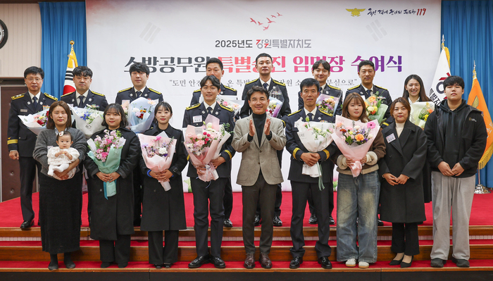 [스포츠서울ㅣ춘천=김기원기자]강원특별자치도(도지사 김진태)는 12월 3일 도청 신관 대회의실에서 도민의 생명과 안전을 지키는 데 헌신한 우수 소방공무원 8명에 대해 특별승진 임용장 수여식을 개최했다고 밝혔다.