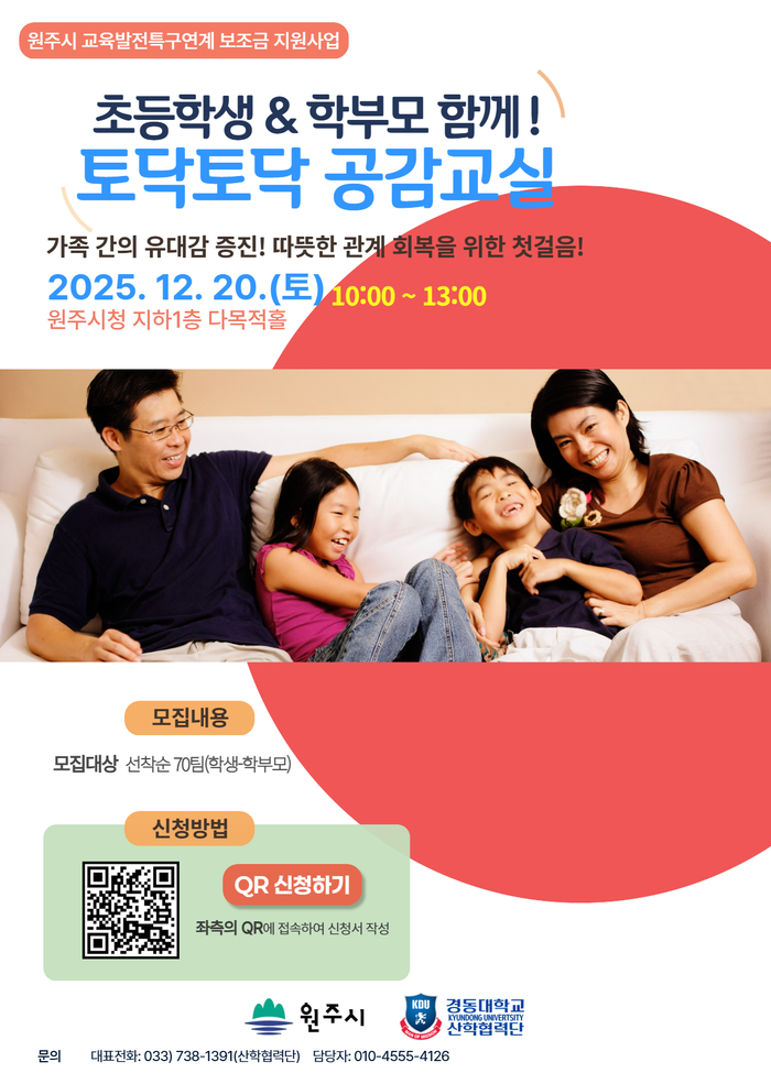 마지막으로 20일에는 시청 지하1층 다목적홀에서 학부모와 초등학생이 함께하는 가족 참여형 인성교육 프로그램 ‘토닥토닥 공감교실’이 열린다. 공감, 배려, 감정 표현 등 기본 인성 역량을 가족 단위에서 강화할 수 있도록 체험활동 중심으로 운영될 예정이다.