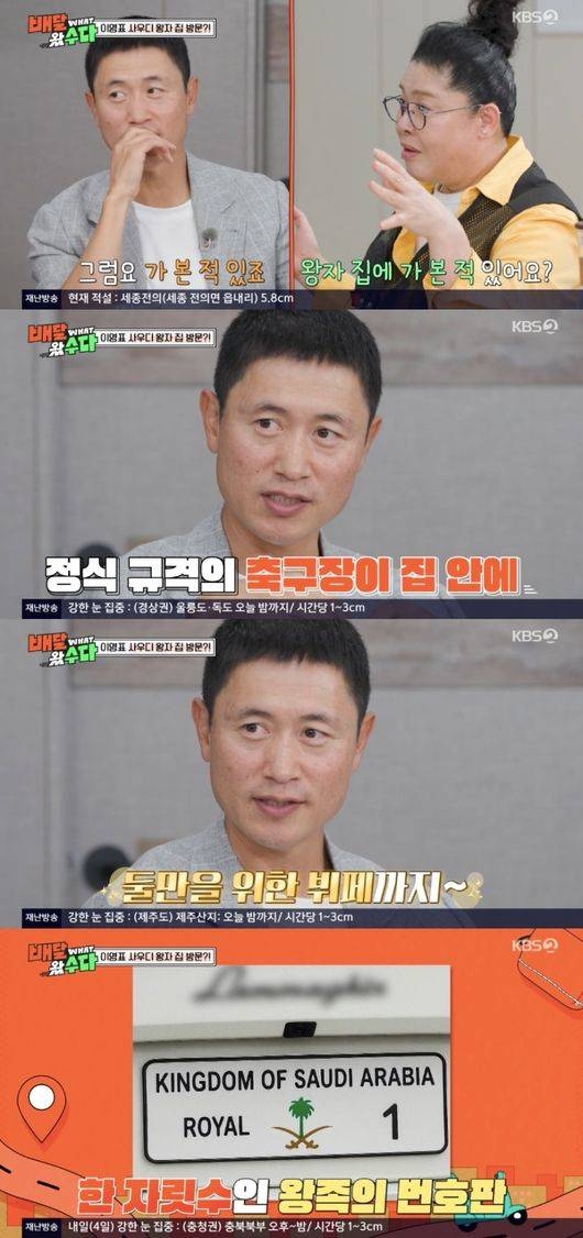 이영표는 “집 안에 정식 규격의 축구장이 있었다. 저와 왕자 둘만을 위해 뷔페가 차려져 있었고, 직원이 일곱 명 정도 줄을 서서 대기하고 있었다”고 전했다.