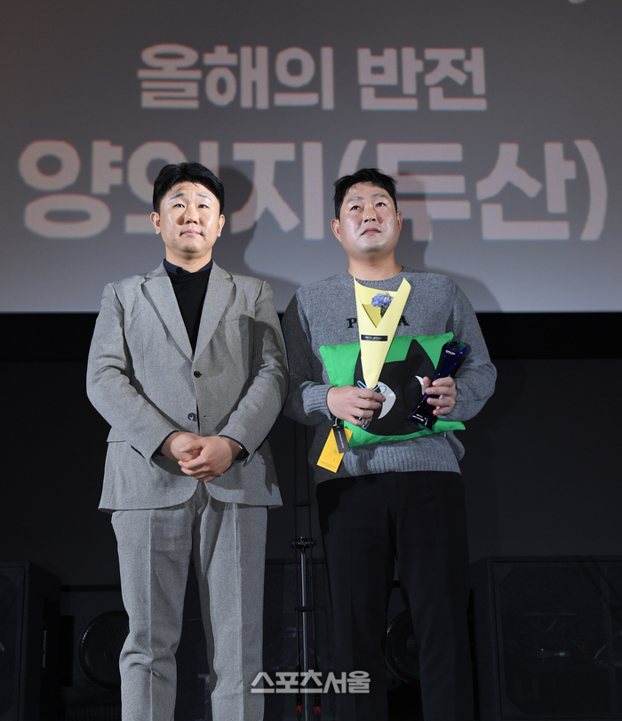 두산 양의지(오른쪽)가 4일 서울 영등포구 타임스퀘어 CGV 영등포 스크린X관에서 열린 ‘제39회 스포츠서울 올해의 상’에서 올해의 반전상을 수상한 뒤 시상자인 시몬스침대 김태헌 팀장과 기념촬영을 하고 있다.