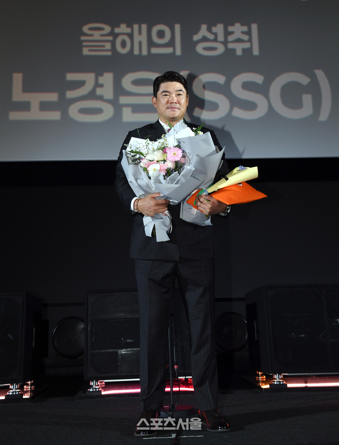 SSG 노경은이 4일 서울 영등포구 타임스퀘어 CGV 영등포 스크린X관에서 열린 ‘제39회 스포츠서울 올해의 상’에서 올해의 성취상을 수상한 뒤 기념촬영을 하고 있다.