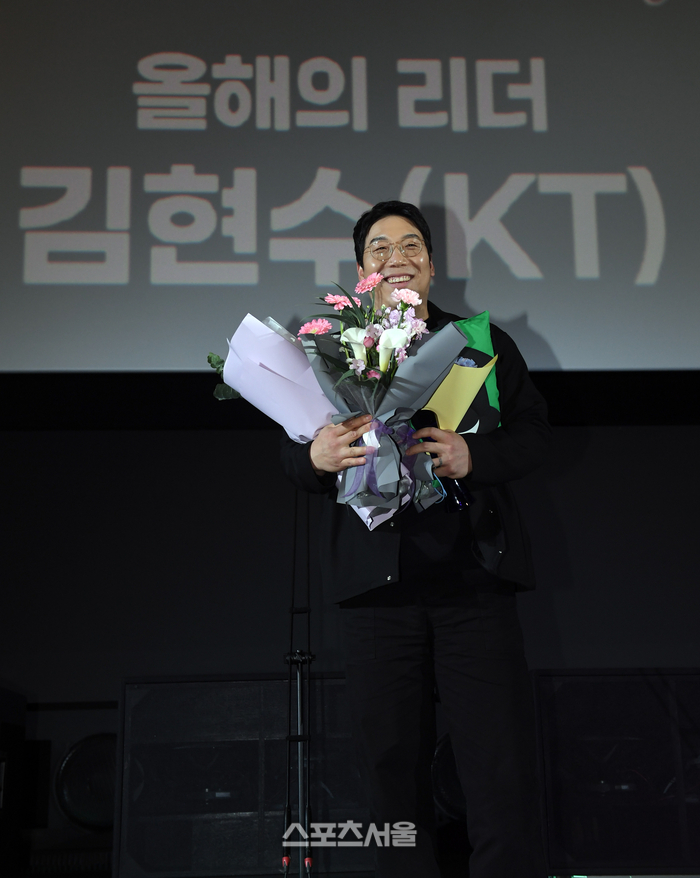 KT 김현수가 4일 서울 영등포구 타임스퀘어 CGV 영등포 스크린X관에서 열린 ‘제39회 스포츠서울 올해의 상’에서 올해의 리더상을 수상한 뒤 기념촬영을 하고 있다.