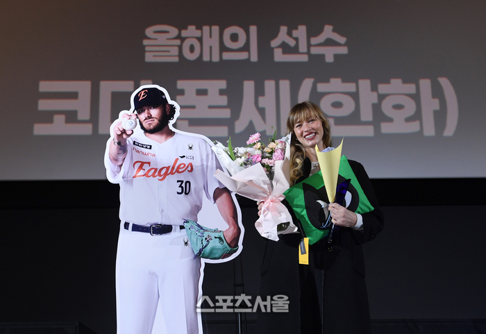 한화 코디 폰세의 아내 엠마 폰세(오른쪽)가 4일 서울 영등포구 타임스퀘어 CGV 영등포 스크린X관에서 열린 ‘제39회 스포츠서울 올해의 상’에서 올해의 선수상을 대리 수상한 뒤 남편의 등신대를 놓고 기념촬영을 하고 있다.