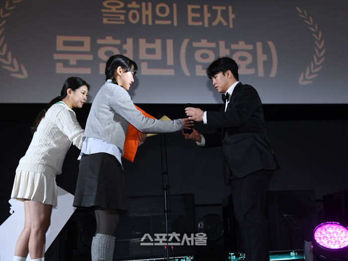 4일 서울 영등포구 타임스퀘어 CGV 영등포 스크린X관에서 열린 ‘제39회 스포츠서울 올해의 상’에서 추첨에 당첨된 한 야구팬(가운데)이 한하 문현빈에게 올해의 선수상을 시상하고 있다.