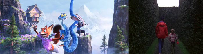 전설적인 거장 스탠리 큐브릭 감독의 대표작으로 꼽히는 레전드 스릴러 영화 '샤이닝'의 명장면도 '주토피아 2' 속에 절묘하게 녹아있다. 작품 후반부 펼쳐지는 주디와 닉의 숨 막히는 설원 추격전은 눈 덮인 거대한 울타리 미로에서 펼쳐진다. 이는 영화 '샤이닝'에서 가장 긴장감 넘치는 장면이 연출되는 장소인 미로 정원과 닮아있다. 뿐만 아니라 주디와 닉이 위기를 벗어나기 위해 제설차를 활용하는 설정 역시 '샤이닝'을 유쾌하게 패러디한 요소다.