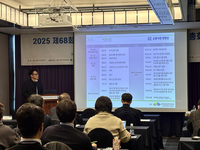 식품진흥원은 ‘순환자원을 위한 디지털, 정책, 기술’ 세션에서 ▲순환자원을 위한 기술지원사례(허준 과장), ▲그린워싱동향 및 향후 전망(조성문 실장, 한국환경산업기술원), ▲순환자원 포장 최적화를 위한 디지털 전환과 시뮬레이션 접근(정현모 교수, 경북과학대학교) 주제로 발표를 진행했다.